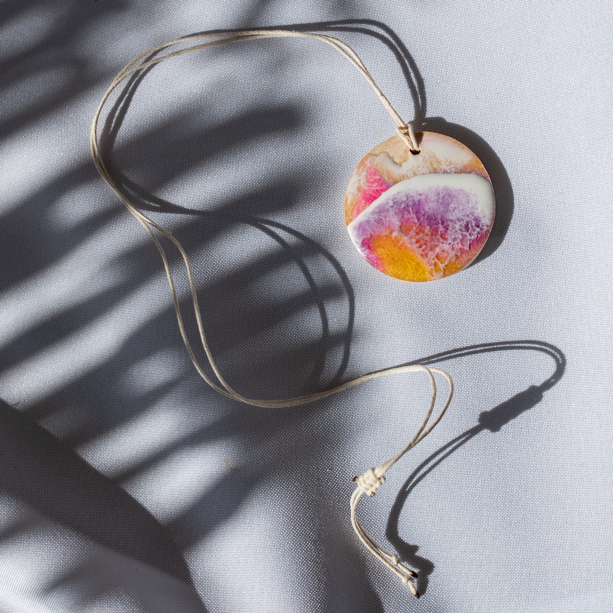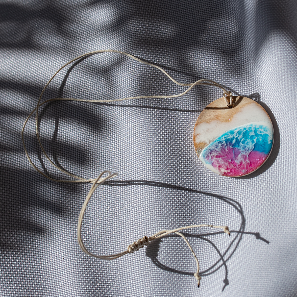 Wisiorek Ø4,3 cm, na drewienku bukowym i sznureczku z regulacją, okrągły, kolor różowy
