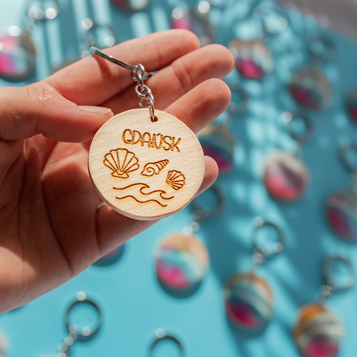 Kolorowy breloczek z żywicy – mały kawałek Gdańska.