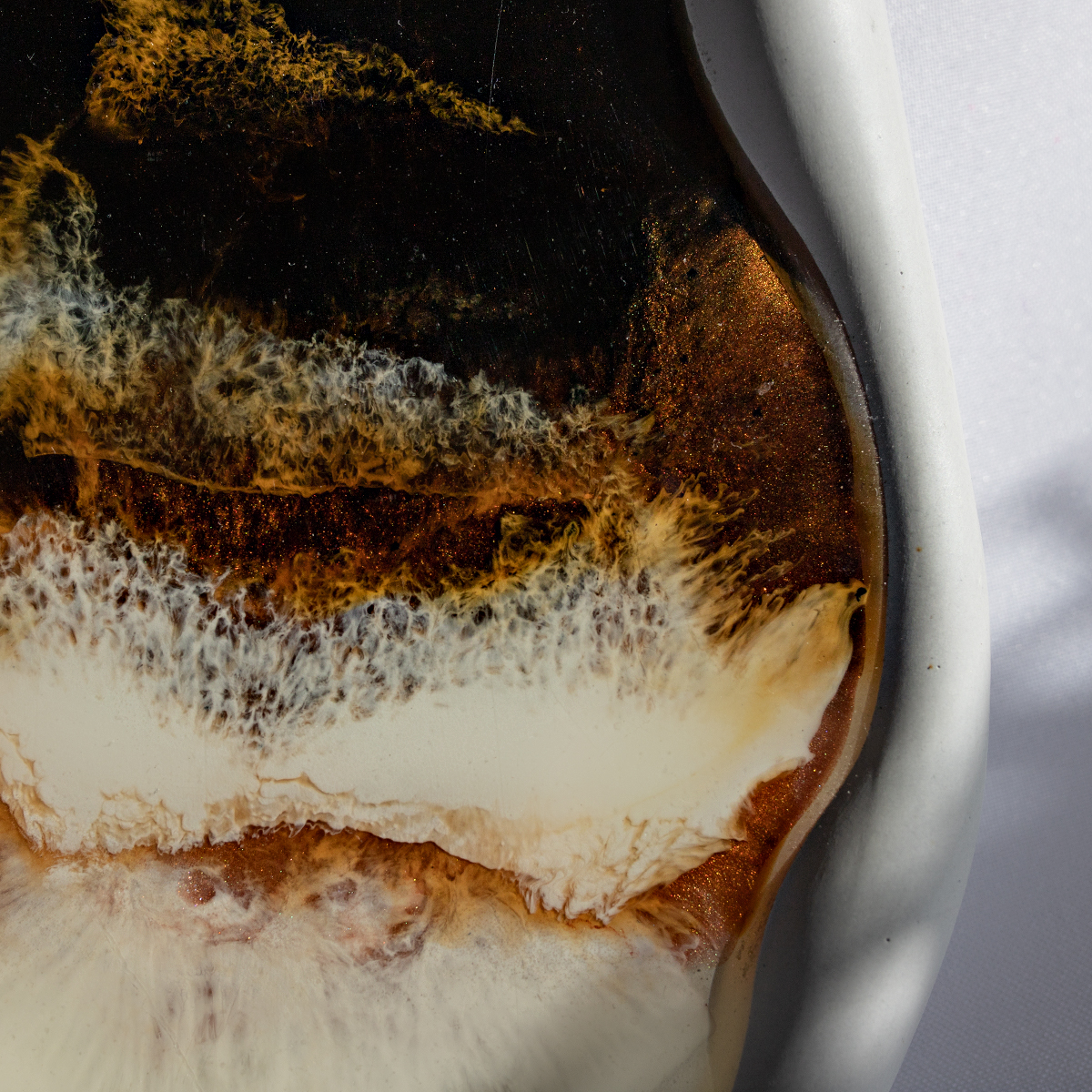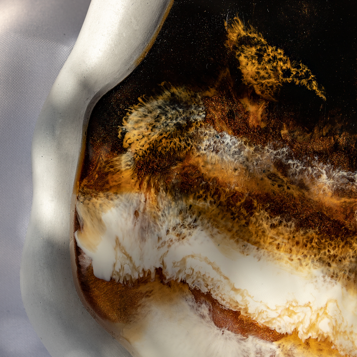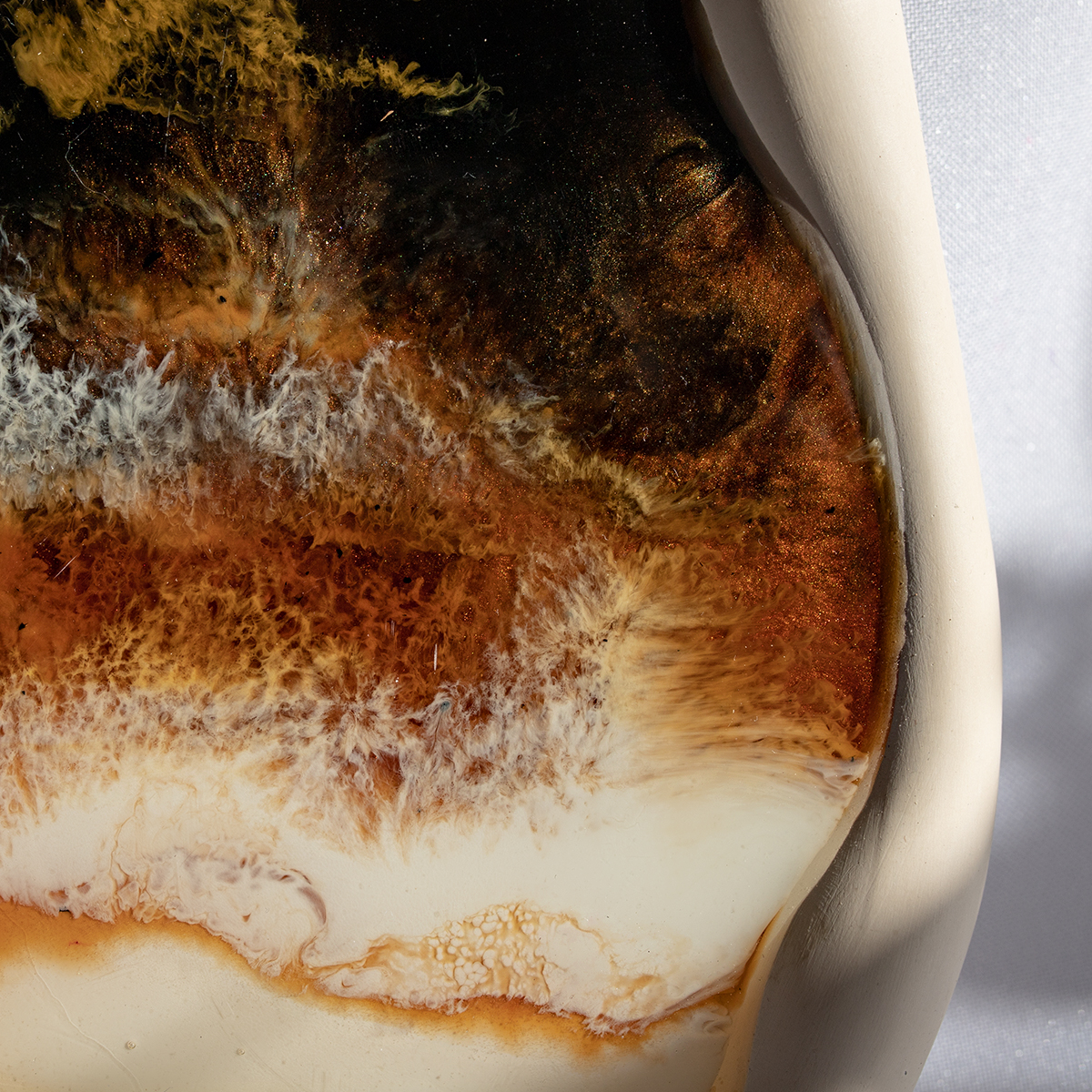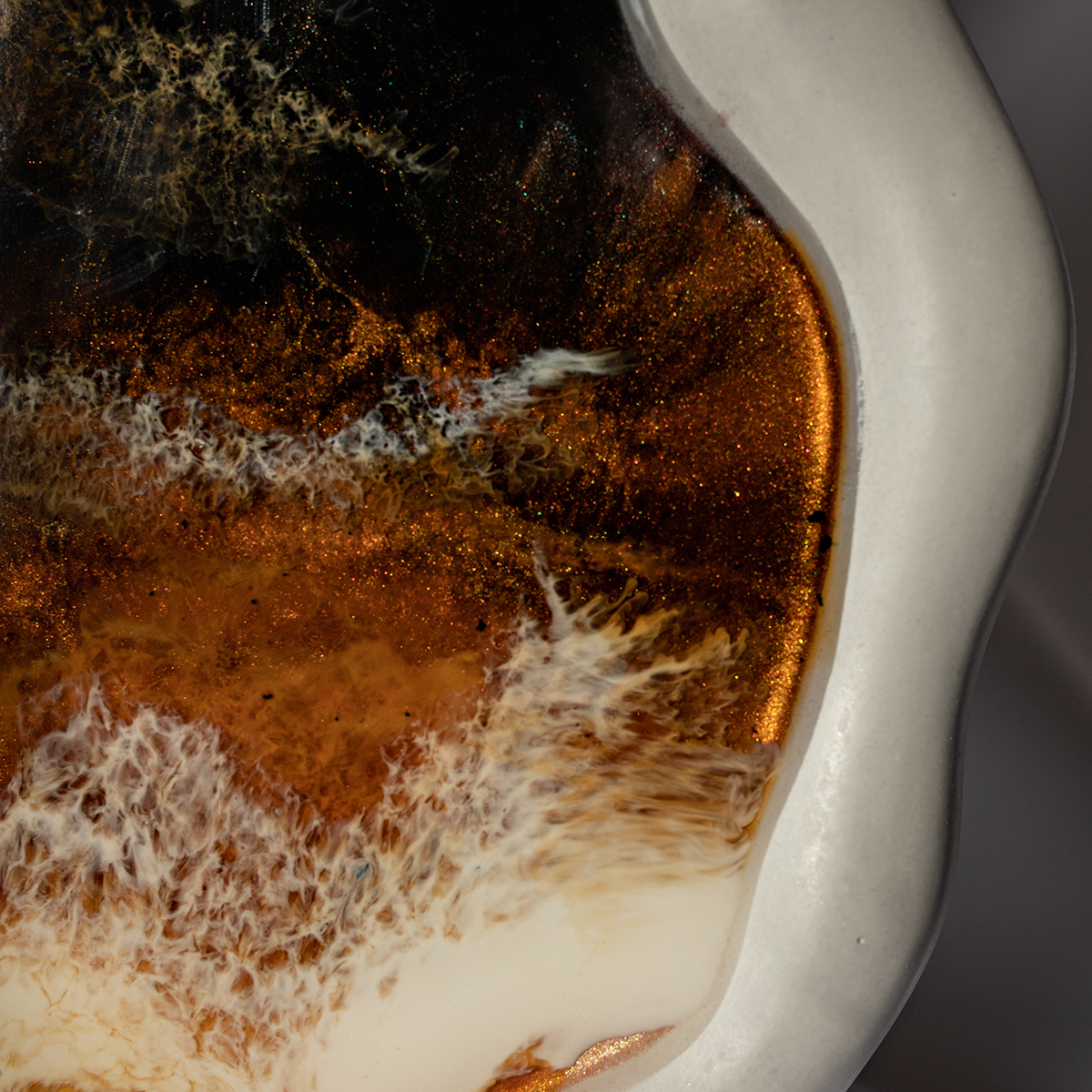 Spód wykonuję z gipsu polimerowego, szlofuję go, oznaczam, lakieruje, a potem maluje na nim kilka warstw żywicą epoksydową, intuicyjnie, zgodnie z tym, co podpowiada mi kolor i kompozycja.