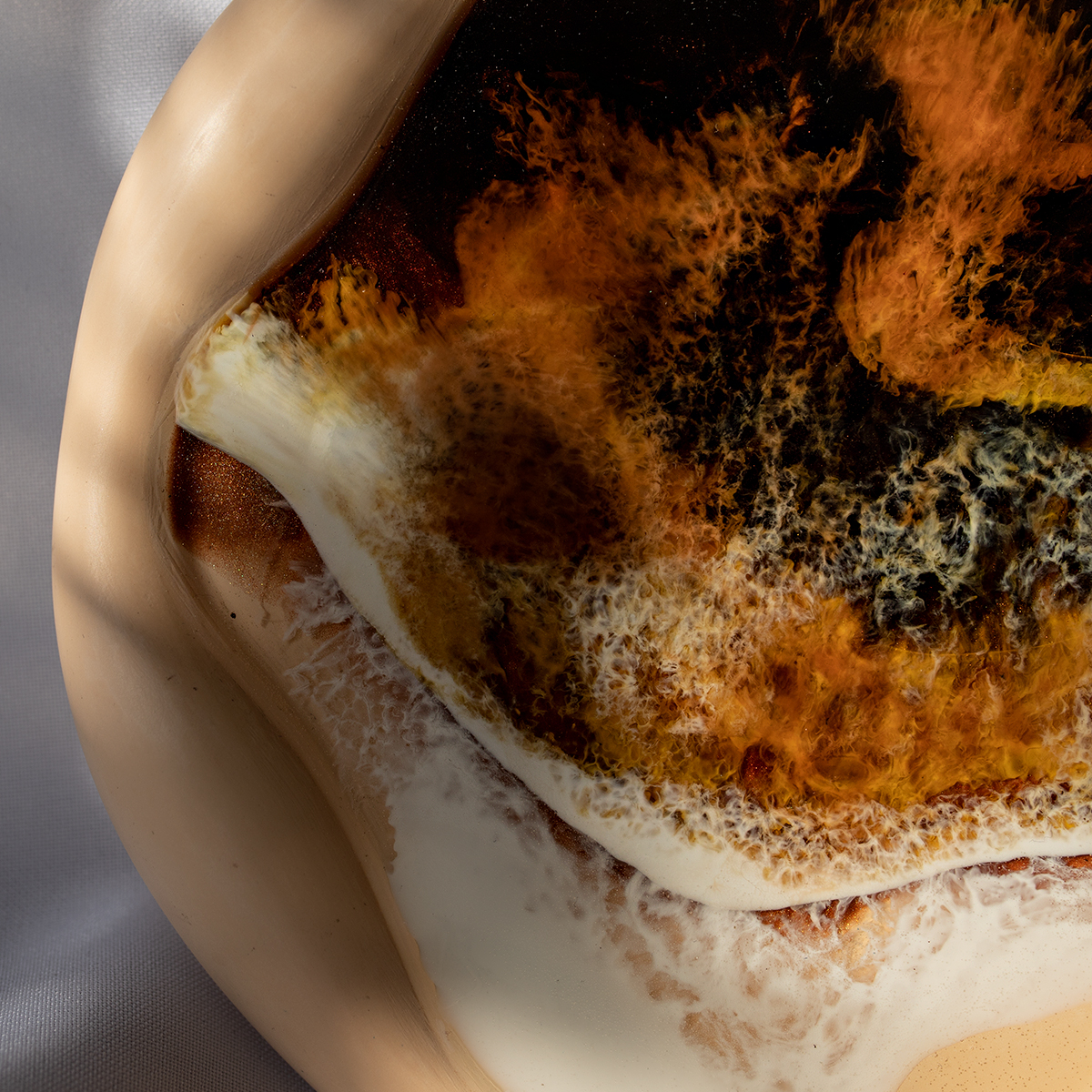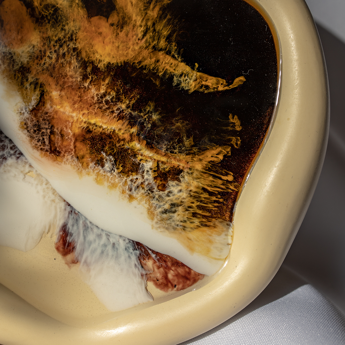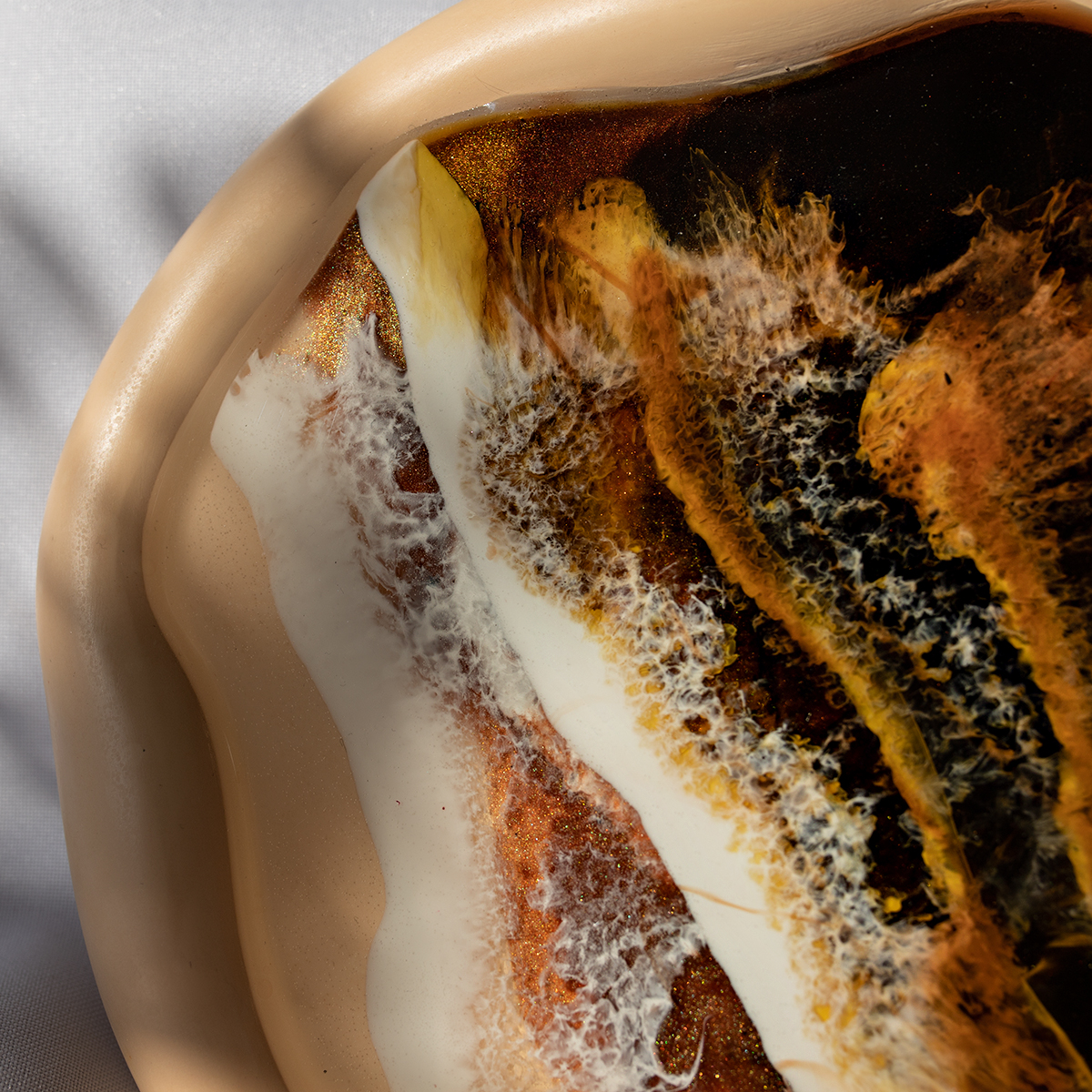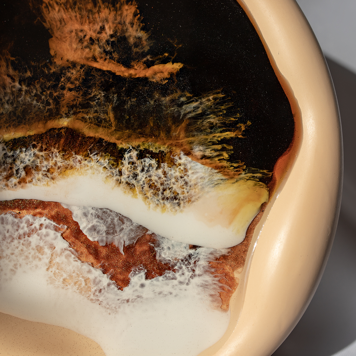 Spód wykonuję z gipsu polimerowego, szlofuję go, oznaczam, lakieruje, a potem maluje na nim kilka warstw żywicą epoksydową, intuicyjnie, zgodnie z tym, co podpowiada mi kolor i kompozycja.
