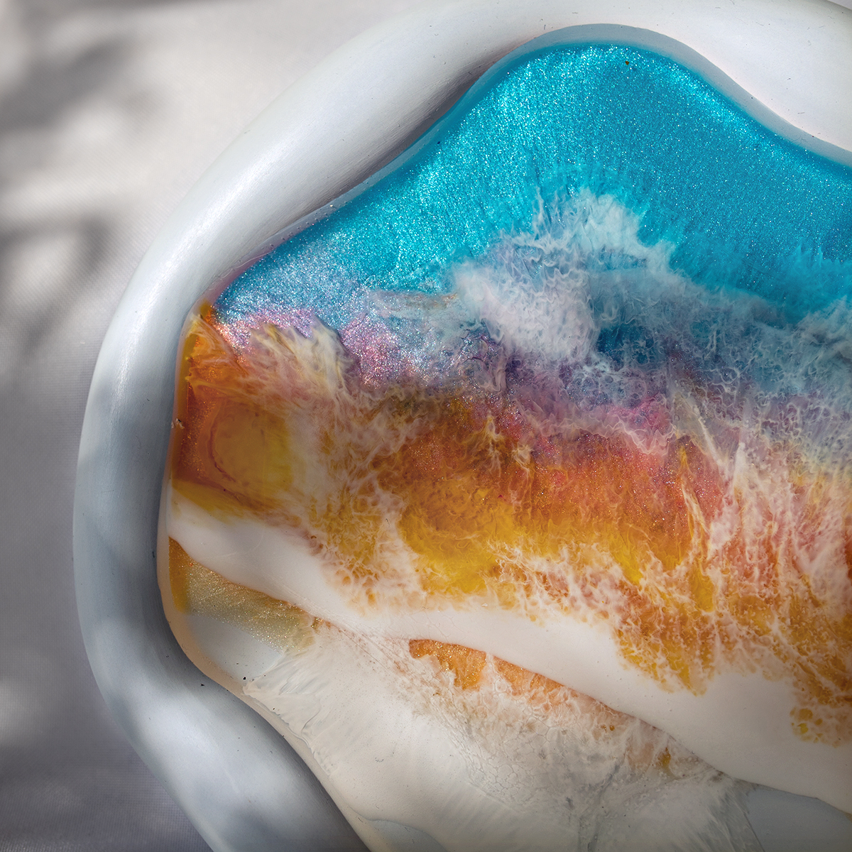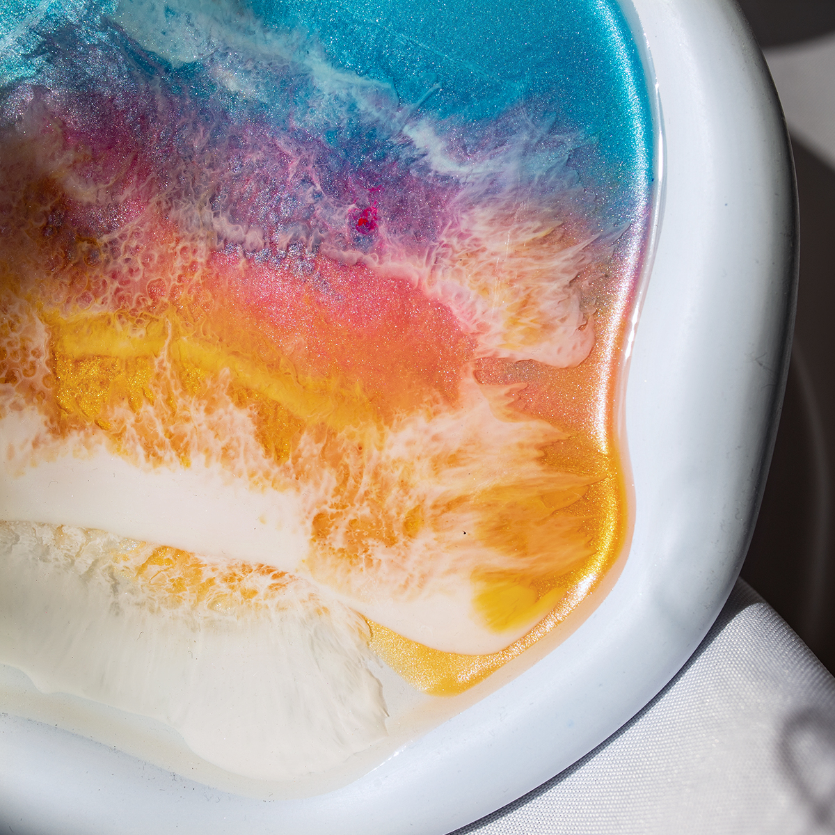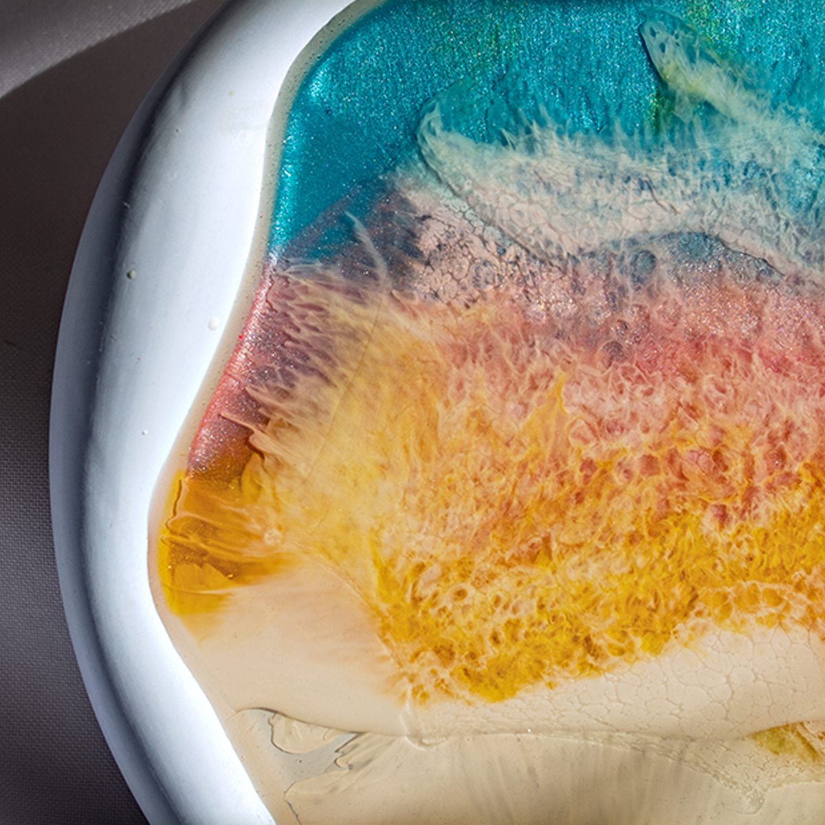 Spód wykonuję z gipsu polimerowego, szlofuję go, oznaczam, lakieruje, a potem maluje na nim kilka warstw żywicą epoksydową, intuicyjnie, zgodnie z tym, co podpowiada mi kolor i kompozycja.