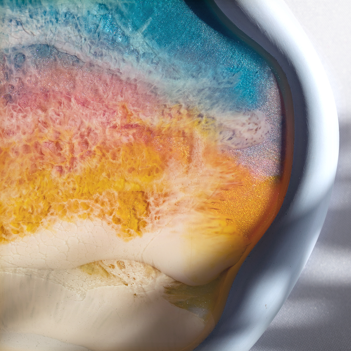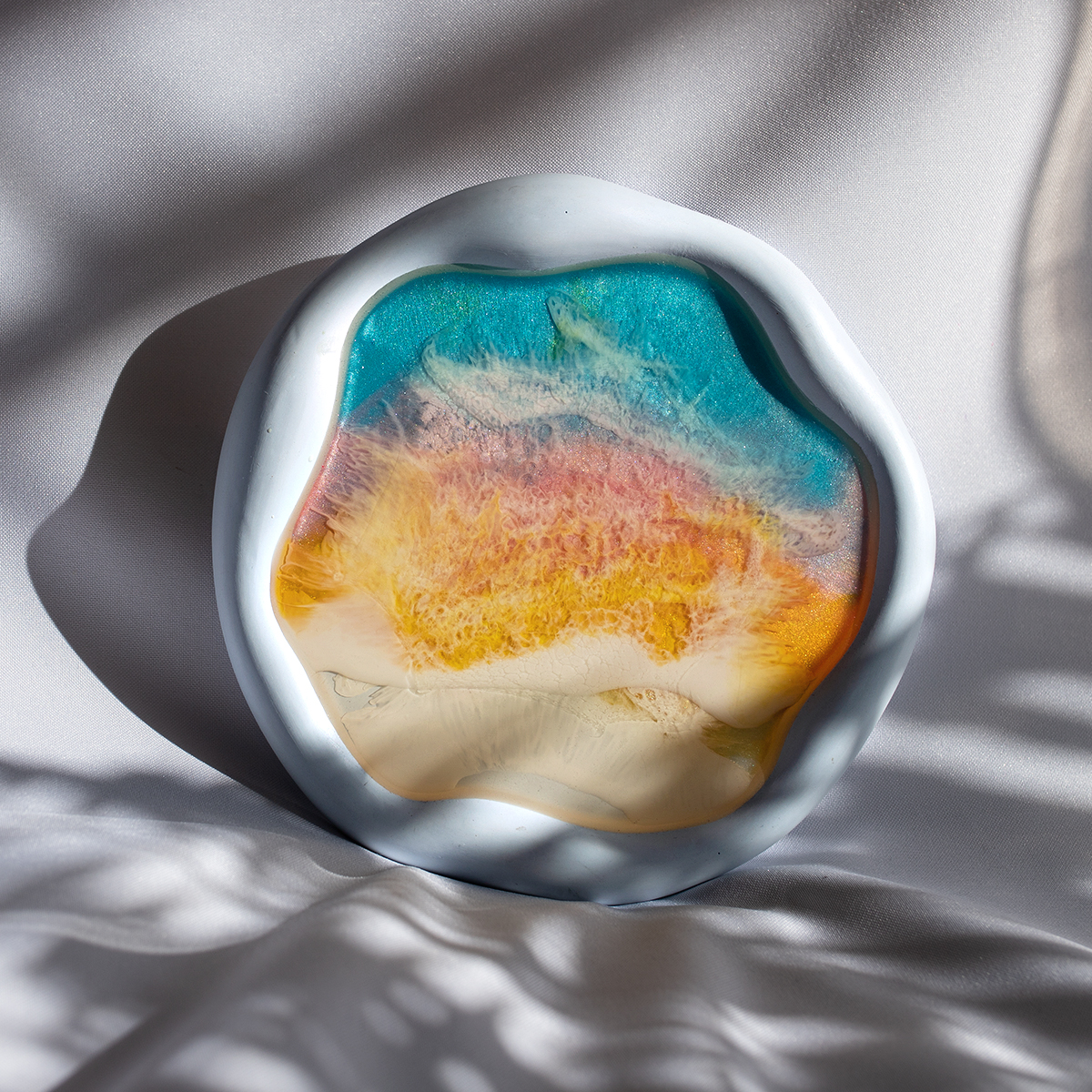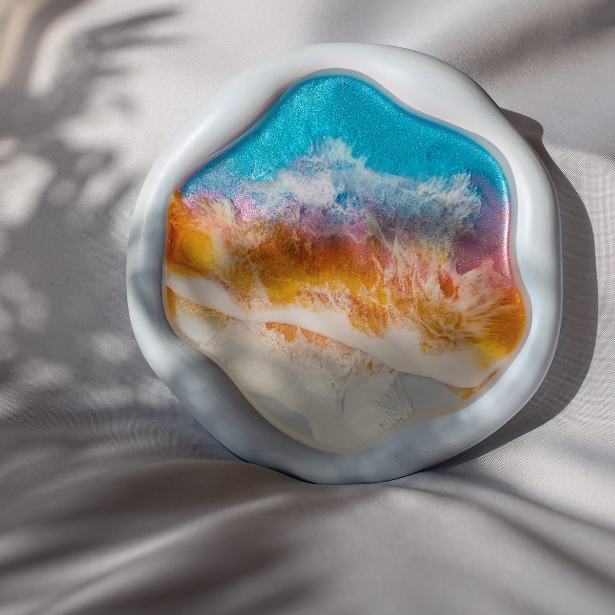 Spód wykonuję z gipsu polimerowego, szlofuję go, oznaczam, lakieruje, a potem maluje na nim kilka warstw żywicą epoksydową, intuicyjnie, zgodnie z tym, co podpowiada mi kolor i kompozycja.
