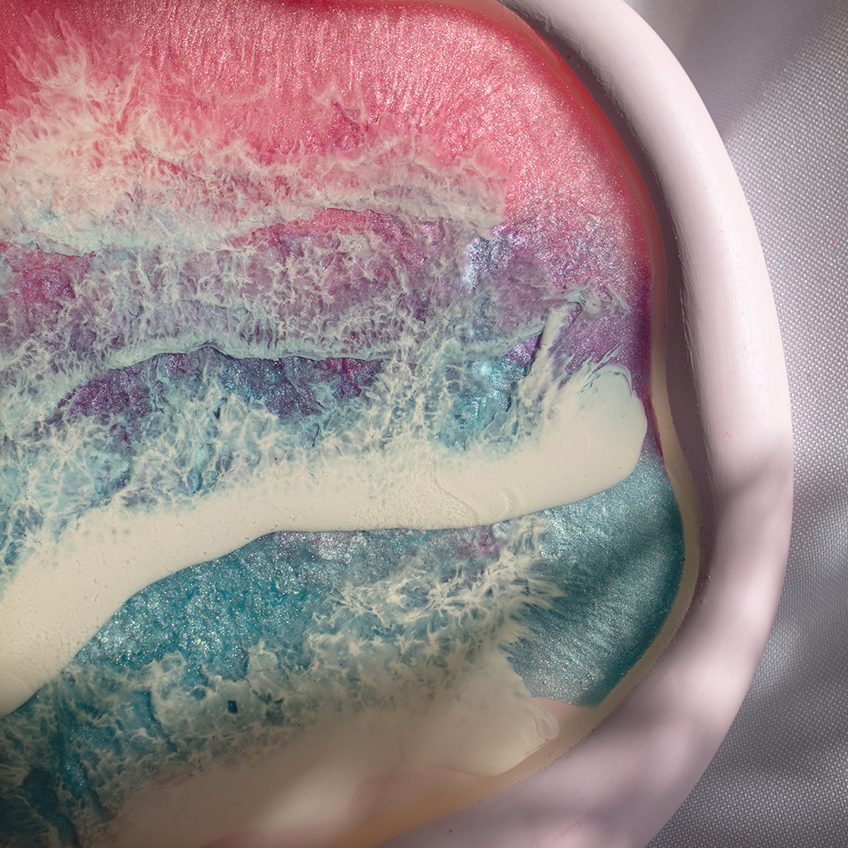 Spód wykonuję z gipsu polimerowego, szlofuję go, oznaczam, lakieruje, a potem maluje na nim kilka warstw żywicą epoksydową – intuicyjnie, zgodnie z tym, co podpowiada mi kolor i kompozycja.